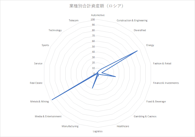 これもまた一目瞭然で、「エネルギー」「金属・鉱業」の2つが突き抜けています。つまり天然資源に大きく依存した経済構造を反映しており、政権とのコネによって利権を手にした資源ビリオネアたちが富を独占している様子が見て取れます。
